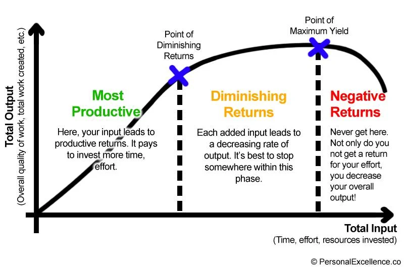 In economic classes, you often hear of the Law of Diminishing Returns, which states that if one input in the production of a commodity is increased while all other inputs are held fixed, a point will eventually be reached at which additions of the input yield progressively smaller, or diminishing, increases in output. If I haven't bored you to death yet, this simply means that there is a point where if more stimulus is added, you get less results. Even though this is an economic law, it applies 100% to athletics. There is a sweet spot of training stress for every individual athlete and it is only through listening, observing, and trial and error that this sweet spot is found. Every athlete's sweet spot looks completely different and is dependent on their athletic needs, family, and work stress.